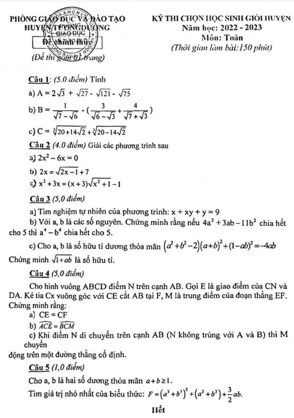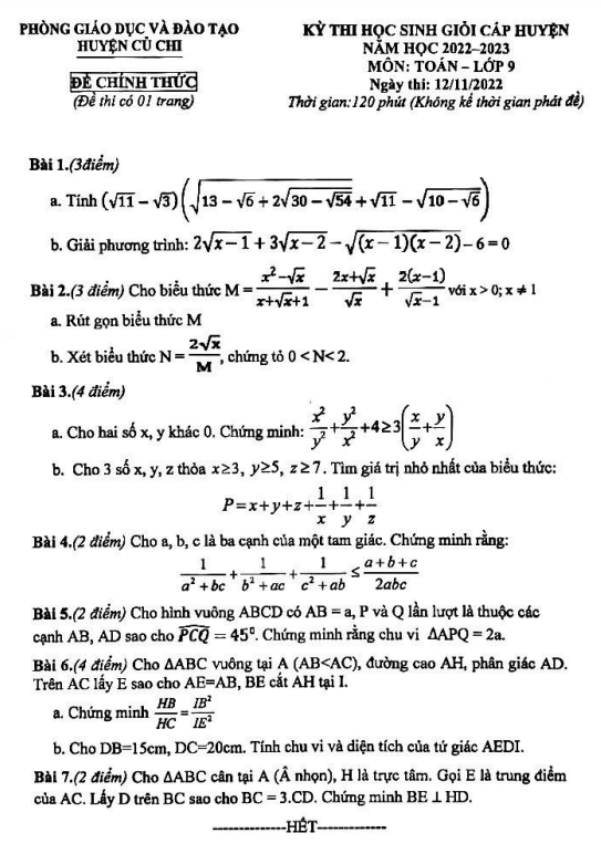 Đề học sinh giỏi huyện Toán 9 năm 2022 – 2023 phòng GD&ĐT Củ Chi – TP HCM