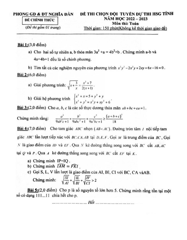 Đề chọn ĐT thi HSG tỉnh Toán 9 năm 2022 – 2023 phòng GD&ĐT Nghĩa Đàn – Nghệ An