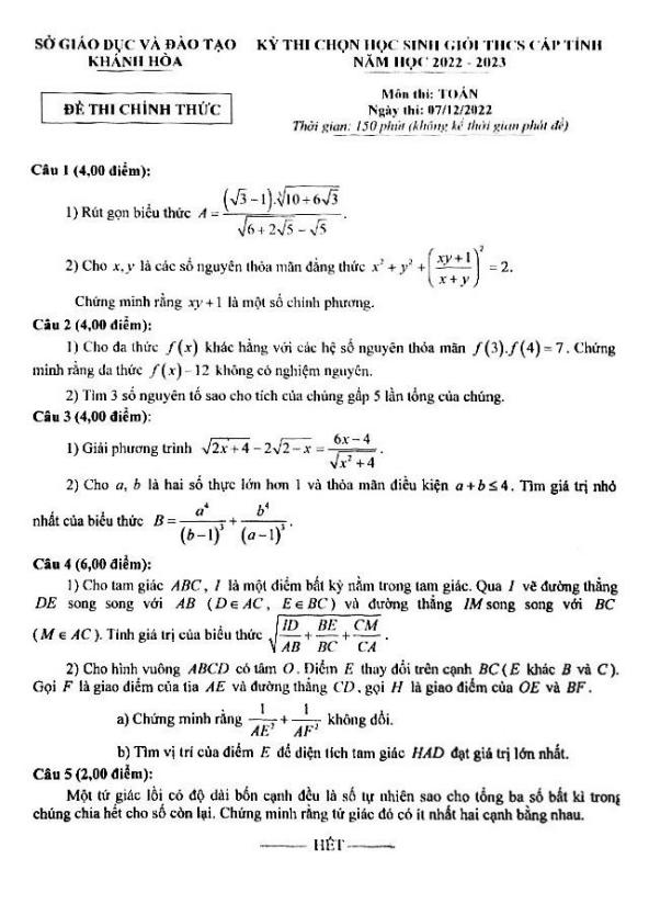 Đề học sinh giỏi cấp tỉnh Toán THCS năm 2022 – 2023 sở GD&ĐT Khánh Hòa