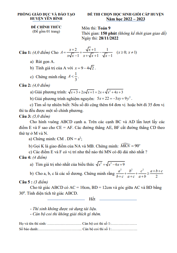 Đề học sinh giỏi huyện Toán 9 năm 2022 – 2023 phòng GD&ĐT Yên Bình – Yên Bái