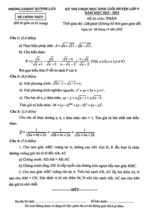 Đề HSG cấp huyện Toán 9 năm 2022 – 2023 phòng GD&ĐT Quỳnh Lưu – Nghệ An