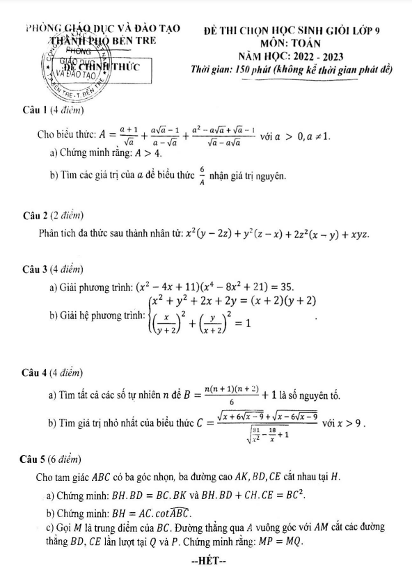 Đề thi chọn học sinh giỏi Toán 9 năm 2022 – 2023 phòng GD&ĐT Bến Tre