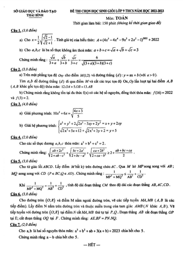 Đề thi chọn học sinh giỏi Toán 9 năm 2022 – 2023 phòng GD&ĐT Thái Bình