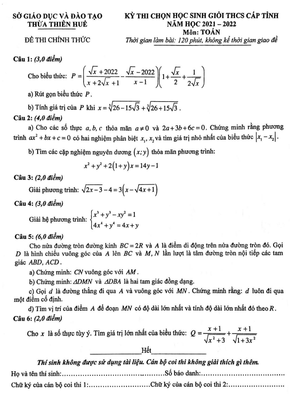 Đề học sinh giỏi tỉnh Toán THCS năm 2021 – 2022 sở GD&ĐT Thừa Thiên Huế