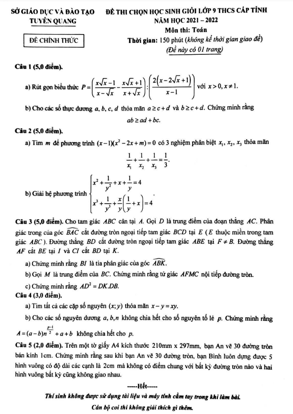 Đề học sinh giỏi Toán 9 cấp tỉnh năm 2021 – 2022 sở GD&ĐT Tuyên Quang