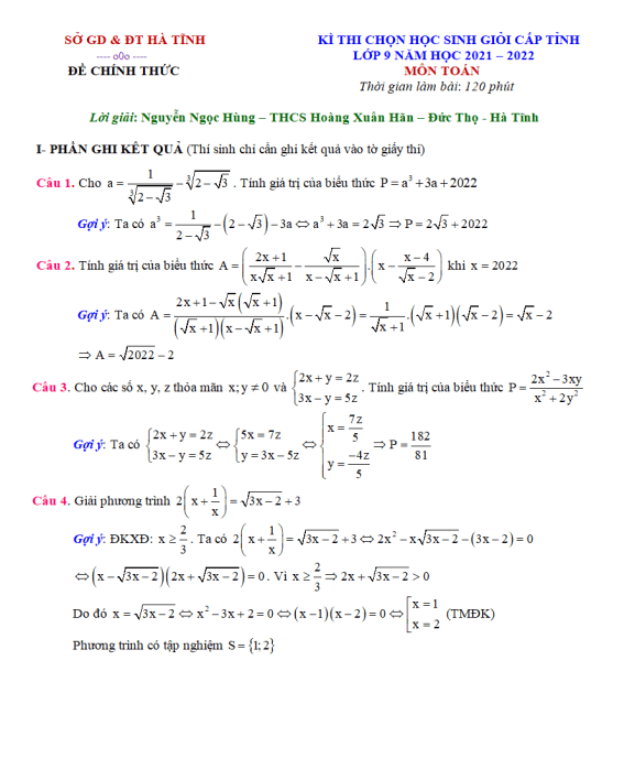 Đề thi học sinh giỏi tỉnh Toán 9 năm 2021 – 2022 sở GD&ĐT Hà Tĩnh