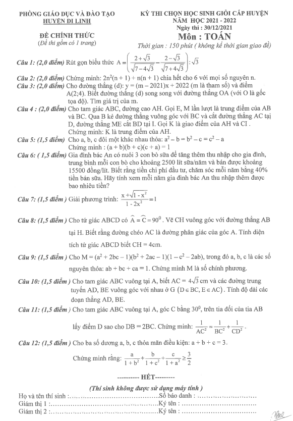 Đề học sinh giỏi huyện môn Toán năm 2021 – 2022 phòng GD&ĐT Di Linh – Lâm Đồng