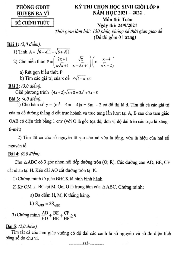 Đề thi học sinh giỏi Toán 9 năm 2021 – 2022 phòng GD&ĐT huyện Ba Vì – Hà Nội