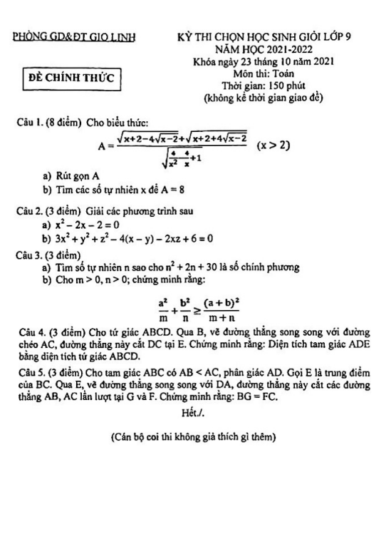 Đề thi chọn học sinh giỏi Toán 9 năm 2021 – 2022 phòng GD&ĐT Gio Linh – Quảng Trị