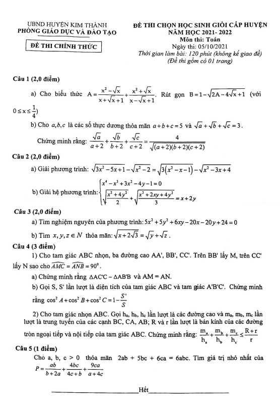 Đề thi HSG Toán cấp huyện năm 2021 – 2022 phòng GD&ĐT Kim Thành – Hải Dương