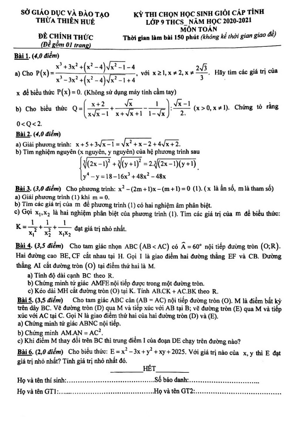 Đề học sinh giỏi tỉnh Toán 9 năm 2020 – 2021 sở GD&ĐT Thừa Thiên Huế