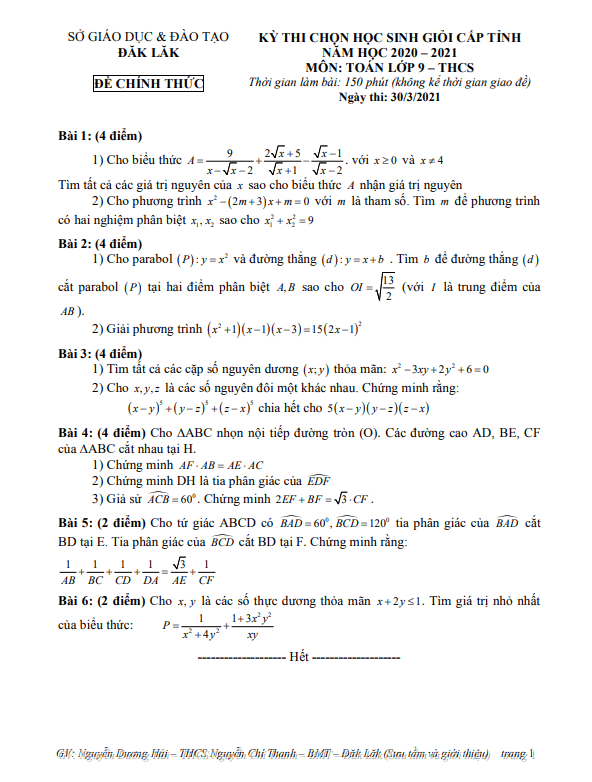 Đề thi học sinh giỏi tỉnh Toán 9 năm 2020 – 2021 sở GD&ĐT Đắk Lắk