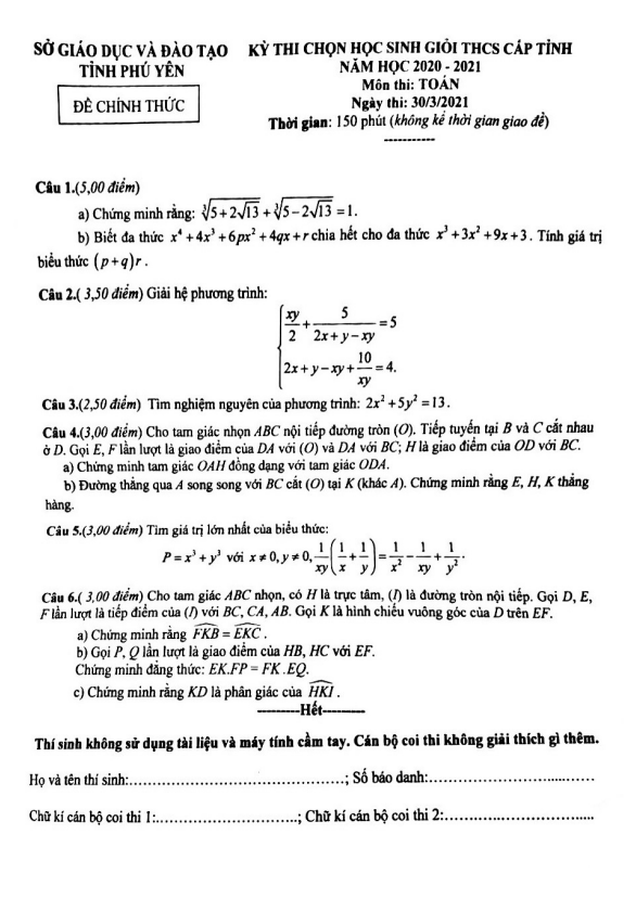 Đề thi học sinh giỏi tỉnh Toán 9 năm 2020 – 2021 sở GD&ĐT Phú Yên