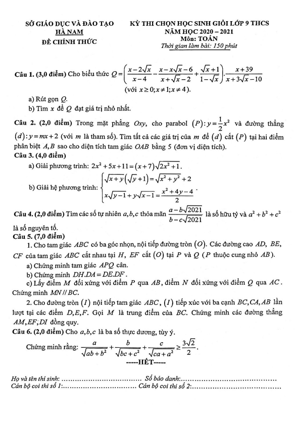 Đề thi học sinh giỏi Toán 9 năm 2020 – 2021 sở GD&ĐT Hà Nam
