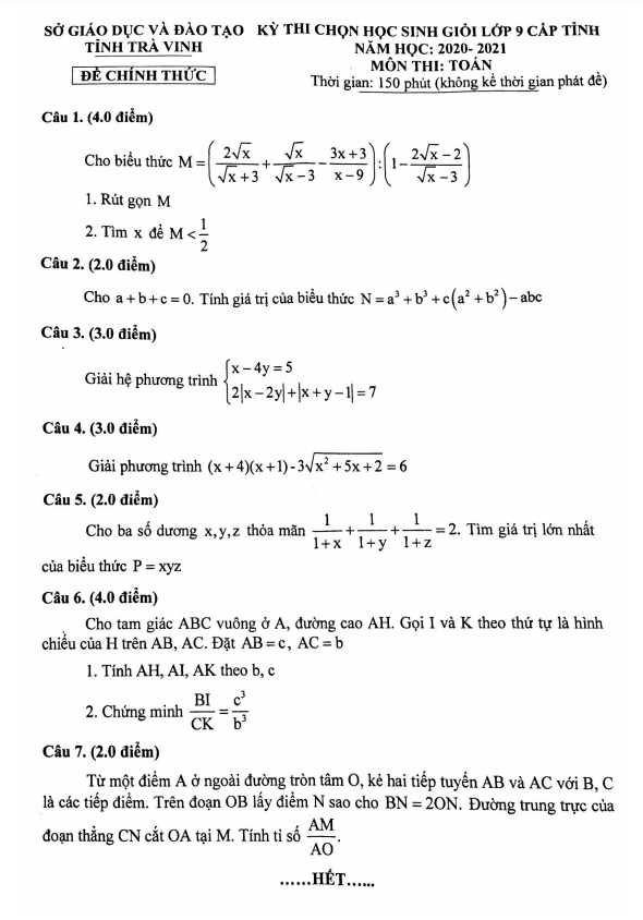 Đề thi học sinh giỏi Toán 9 năm 2020 – 2021 sở GD&ĐT tỉnh Trà Vinh