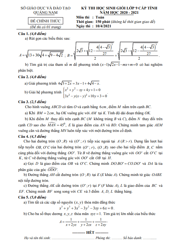 Đề học sinh giỏi tỉnh Toán 9 năm 2020 – 2021 sở GD&ĐT Quảng Nam