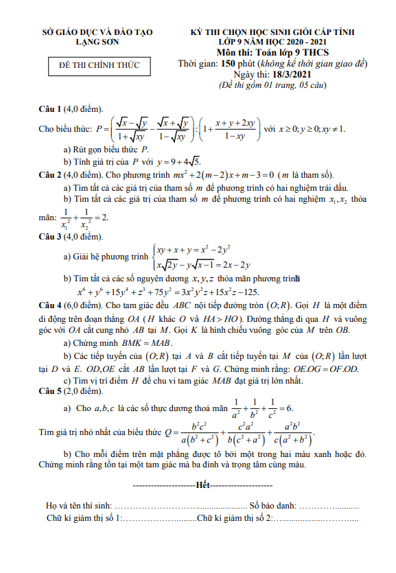 Đề thi học sinh giỏi cấp tỉnh Toán 9 năm 2020 – 2021 sở GD&ĐT Lạng Sơn