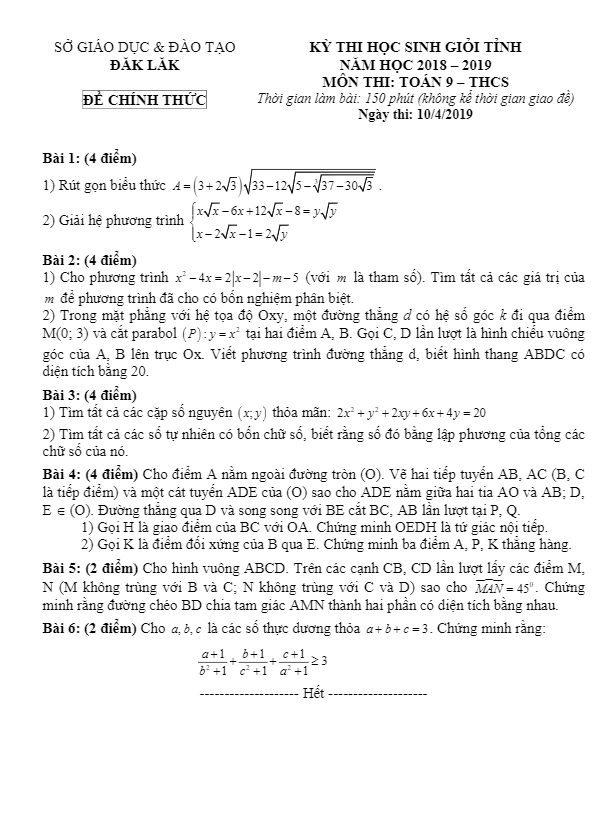 Đề thi học sinh giỏi tỉnh Toán 9 THCS năm 2018 – 2019 sở GD&ĐT Đăk Lăk