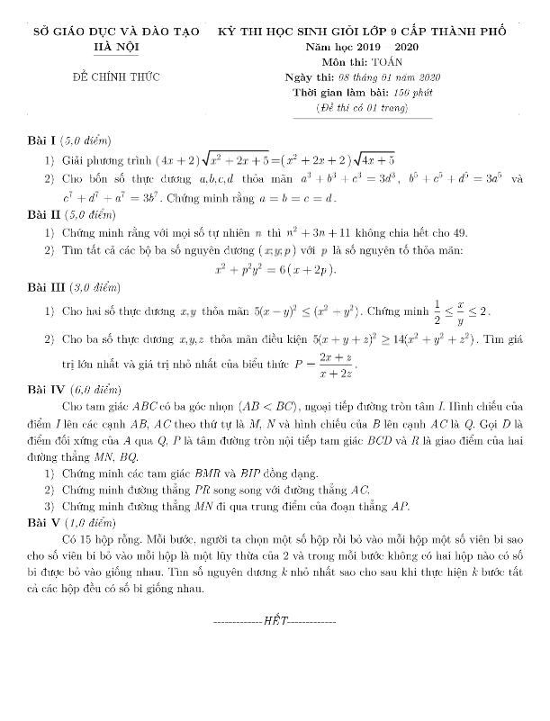 Đề thi HSG Toán 9 cấp thành phố năm học 2019 – 2020 sở GD&ĐT Hà Nội