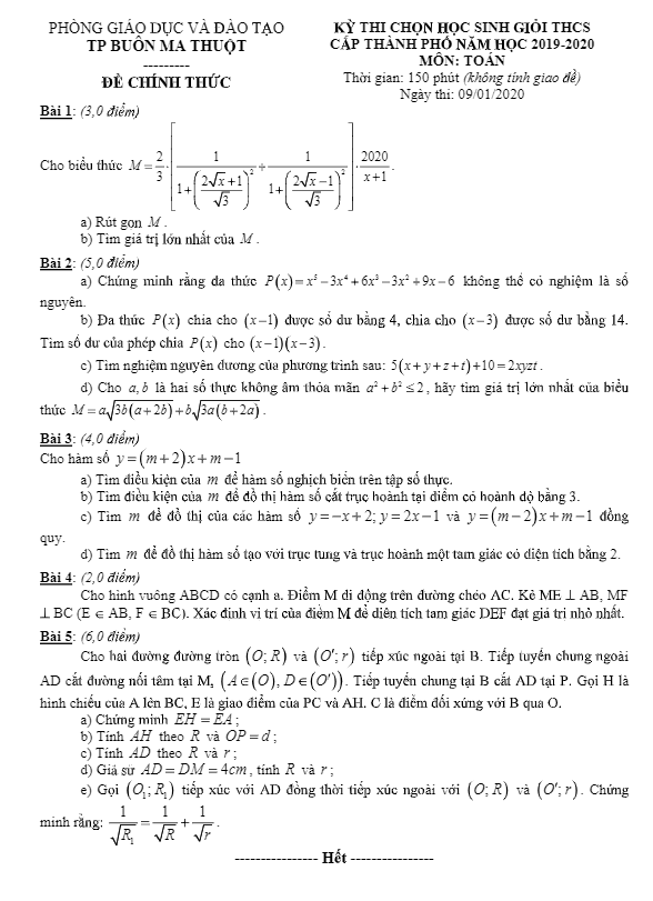 Đề thi HSG Toán 9 năm 2019 – 2020 phòng GD&ĐT Buôn Ma Thuột – Đắk Lắk
