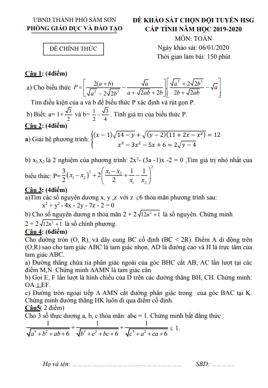 Đề khảo sát đội tuyển HSG Toán 9 năm 2019 – 2020 phòng GD&ĐT Sầm Sơn – Thanh Hoá