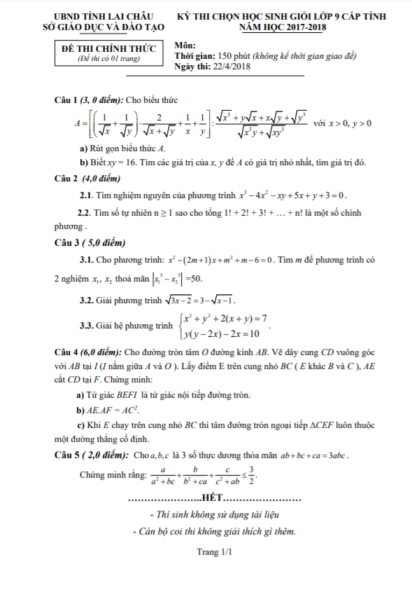 Đề thi học sinh giỏi Toán 9 cấp tỉnh năm 2017 – 2018 sở GD&ĐT Lai Châu