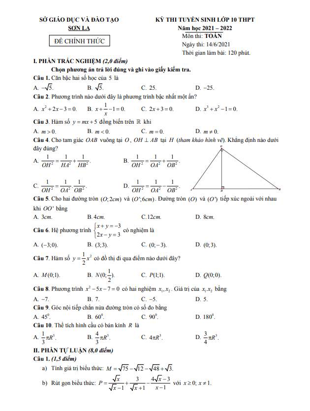 Đề thi tuyển sinh lớp 10 môn Toán năm 2021 – 2022 sở GD&ĐT Sơn La