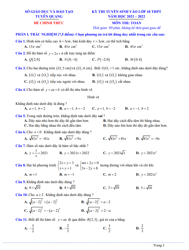 Đề thi tuyển sinh lớp 10 môn Toán năm 2021 – 2022 sở GD&ĐT Tuyên Quang