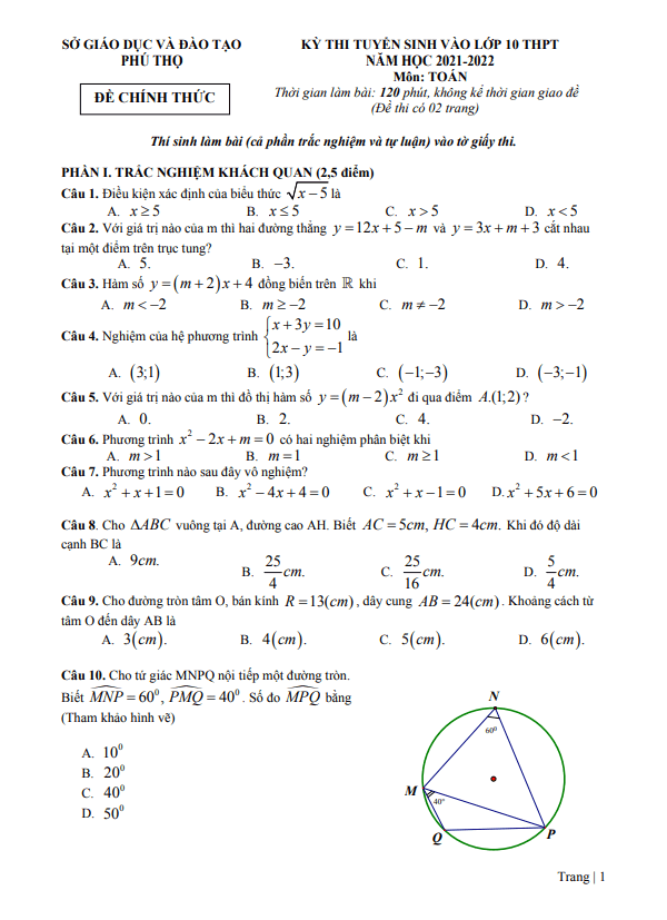 Đề thi tuyển sinh vào lớp 10 môn Toán năm 2021 – 2022 sở GD&ĐT Phú Thọ