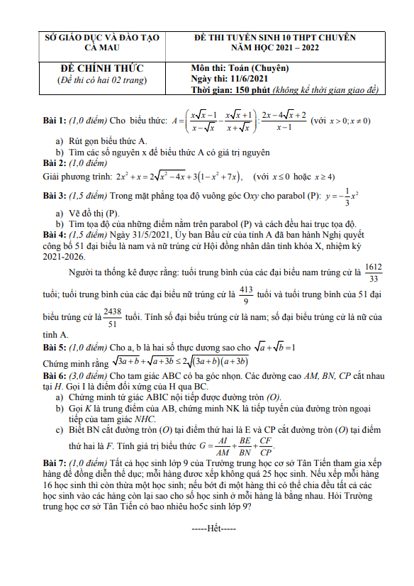 Đề thi vào 10 chuyên môn Toán (chuyên) năm 2021 – 2022 sở GD&ĐT Cà Mau