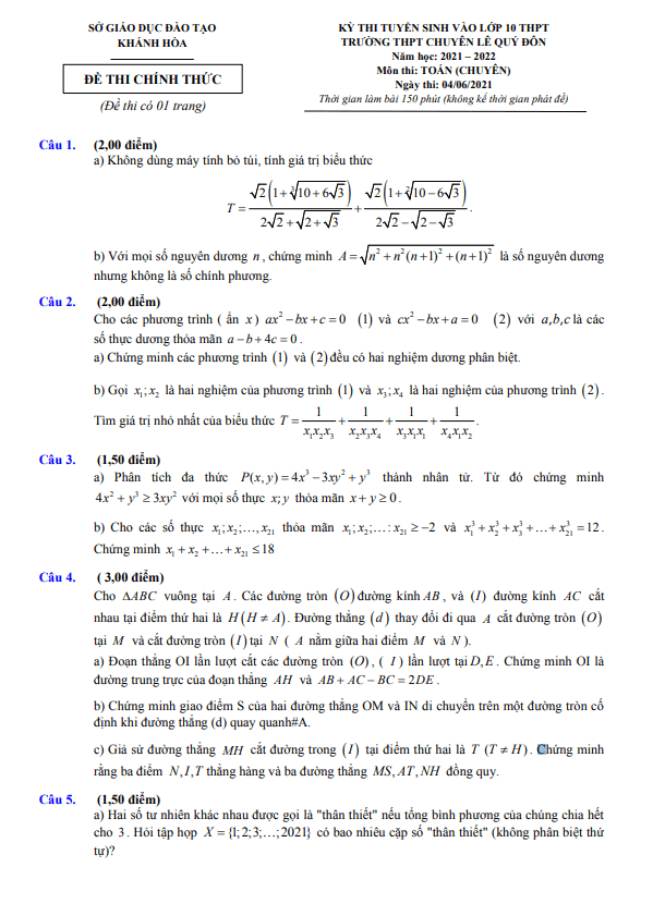 Đề thi vào 10 môn Toán (chuyên) năm 2021 – 2022 trường chuyên Lê Quý Đôn – Khánh Hòa