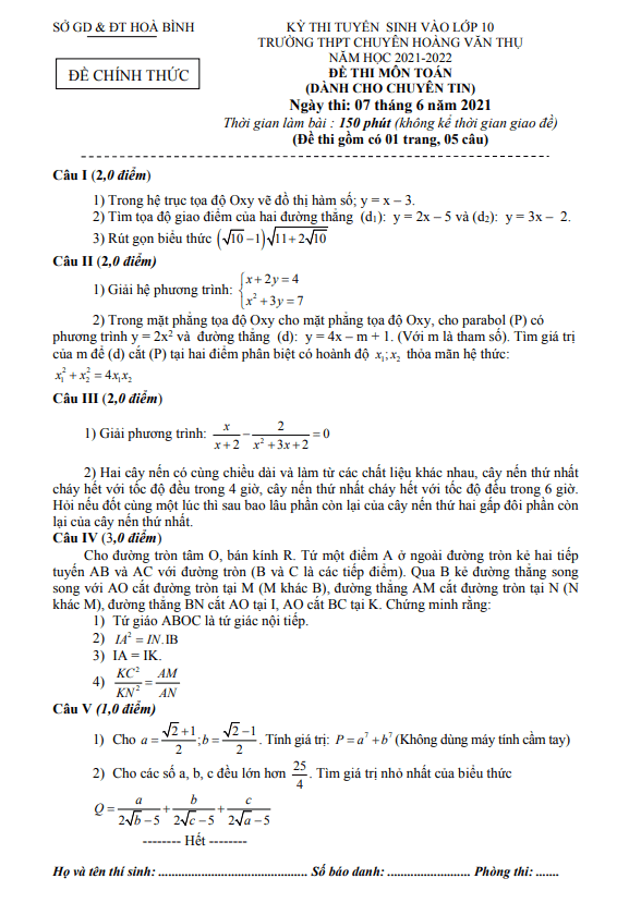 Đề thi vào 10 môn Toán (chuyên Tin) năm 2021 – 2022 trường chuyên Hoàng Văn Thụ – Hòa Bình
