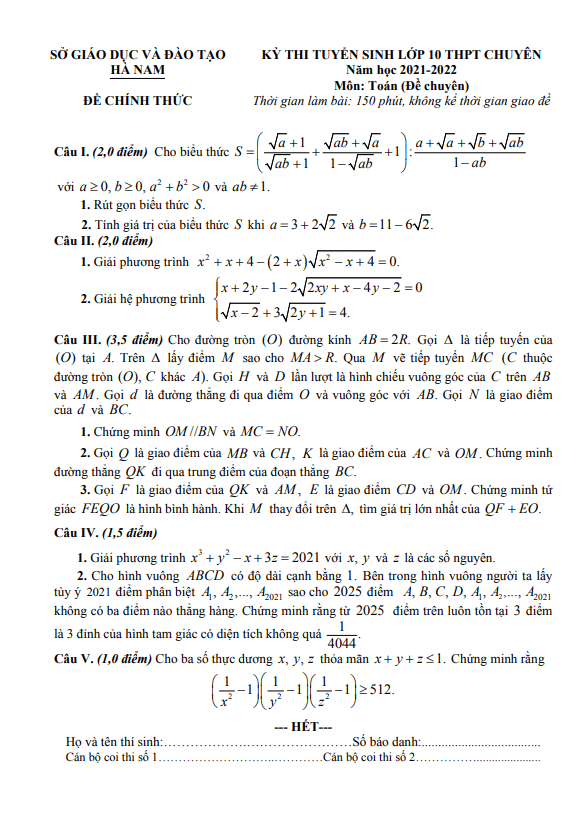 Đề tuyển sinh lớp 10 chuyên môn Toán (chuyên) năm 2021 – 2022 sở GD&ĐT Hà Nam