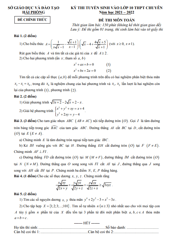 Đề tuyển sinh lớp 10 chuyên môn Toán năm 2021 – 2022 sở GD&ĐT Hải Phòng