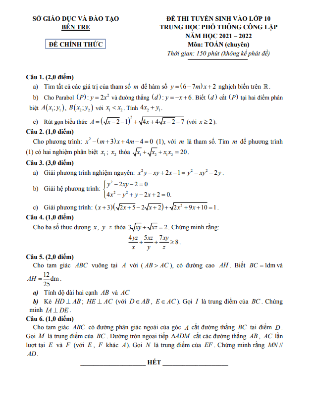Đề tuyển sinh lớp 10 môn Toán (chuyên) năm 2021 – 2022 sở GD&ĐT Bến Tre