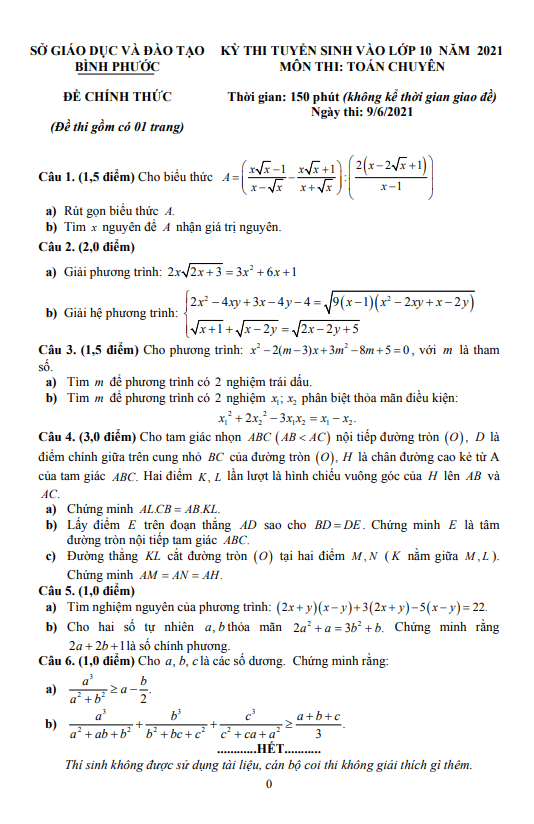 Đề tuyển sinh lớp 10 môn Toán (chuyên) năm 2021 – 2022 sở GD&ĐT Bình Phước