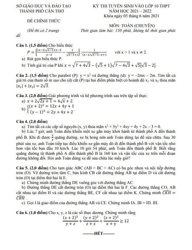 Đề tuyển sinh lớp 10 môn Toán (chuyên) năm 2021 – 2022 sở GD&ĐT Cần Thơ