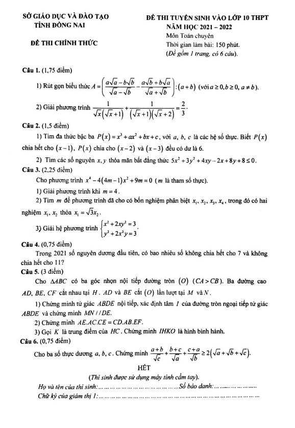 Đề tuyển sinh lớp 10 môn Toán (chuyên) năm 2021 – 2022 sở GD&ĐT Đồng Nai