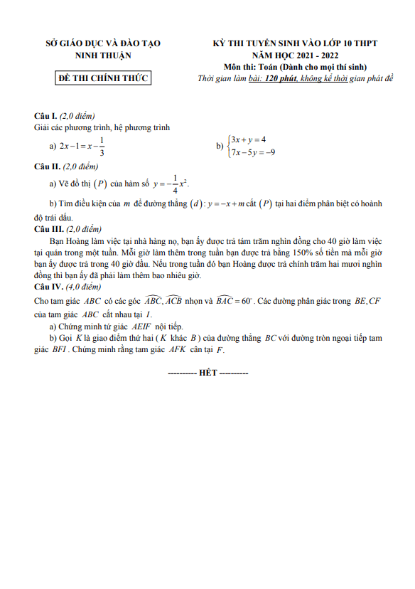 Đề tuyển sinh lớp 10 môn Toán năm 2021 – 2022 sở GD&ĐT Ninh Thuận