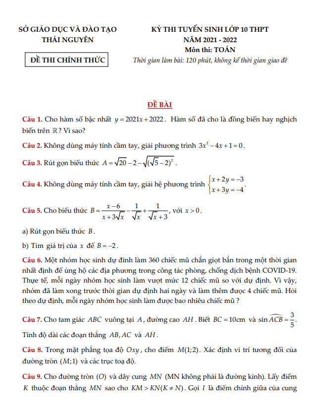 Đề tuyển sinh lớp 10 môn Toán năm 2021 – 2022 sở GD&ĐT Thái Nguyên