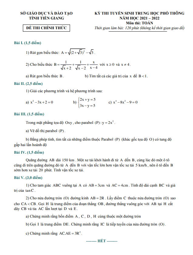 Đề tuyển sinh lớp 10 môn Toán năm 2021 – 2022 sở GD&ĐT Tiền Giang