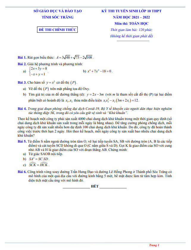 Đề tuyển sinh lớp 10 THPT môn Toán năm 2021 – 2022 sở GD&ĐT Sóc Trăng