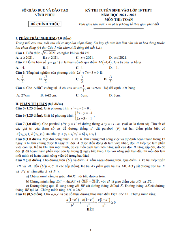 Đề tuyển sinh vào lớp 10 môn Toán năm 2021 – 2022 sở GD&ĐT Vĩnh Phúc