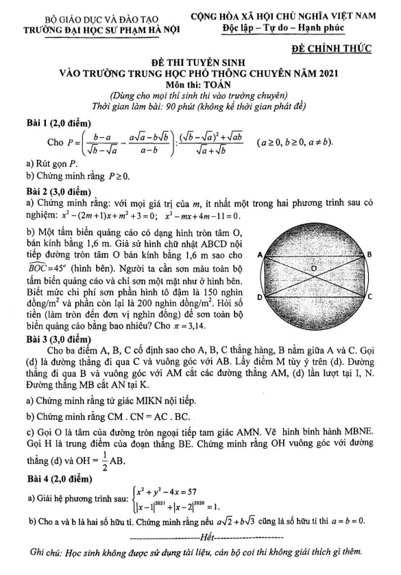 Đề tuyển sinh lớp 10 chuyên môn Toán (chuyên) năm 2021 trường ĐHSP Hà Nội