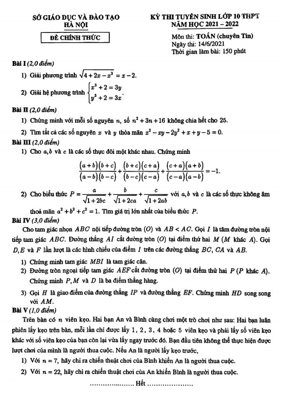 Đề tuyển sinh lớp 10 môn Toán (chuyên Tin) năm 2021 – 2022 sở GD&ĐT Hà Nội