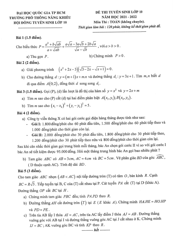 Đề tuyển sinh lớp 10 môn Toán (không chuyên) năm 2021 – 2022 trường PTNK – TP HCM
