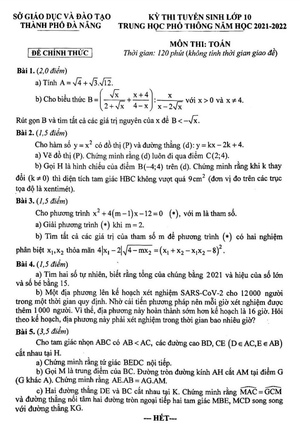 Đề tuyển sinh lớp 10 môn Toán năm 2021 – 2022 sở GD&ĐT Đà Nẵng