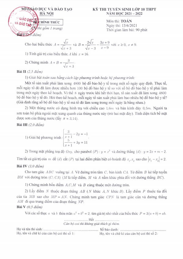 Đề tuyển sinh lớp 10 môn Toán năm 2021 – 2022 sở GD&ĐT Hà Nội
