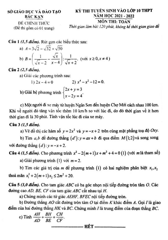Đề tuyển sinh vào lớp 10 môn Toán năm 2021 – 2022 sở GD&ĐT Bắc Kạn