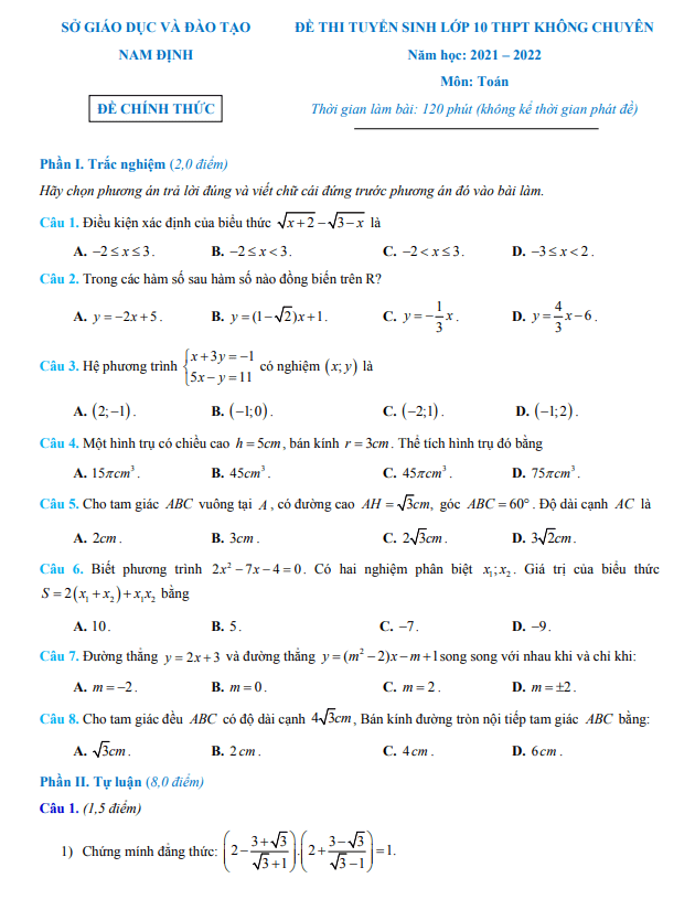 Đề thi tuyển sinh lớp 10 môn Toán năm 2021 – 2022 sở GD&ĐT Nam Định